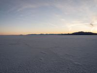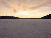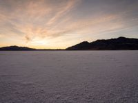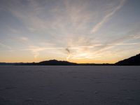 The sun rises over the Bonneville Speedway in Utah, USA, illuminating the salt surface with its golden light. The clear sky is filled with contrails, while the dark desert landscape and distant mountains form a stunning backdrop to this sunny morning.