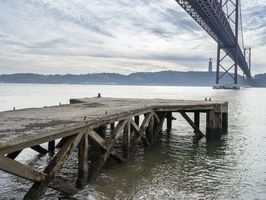 The break of day brings a calm to the beachside landscape in Lisbon, Portugal. A jetty pier and bridge span the lake, with a cloud-filled sky illuminated by sunlight. The shoreline is lined with trees, and the water and asphalt road surface reflect the tints and shades of the natural world.
