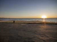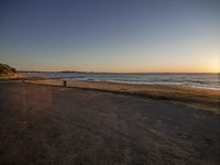 The sun rises, casting a warm glow over the sandy shore, as waves gently crash against the coast, creating a serene atmosphere.