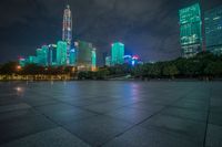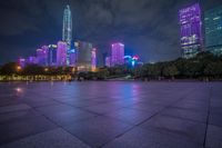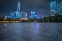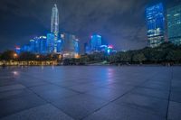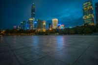 The skyline of the city of Shenzhen, China is illuminated by artificial light and the break of day, creating a dramatic, futuristic urban design with skyscrapers, mountain views, and open spaces for recreation and tourism.