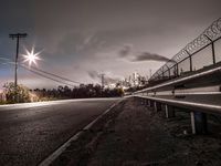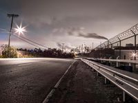 A beautiful sunrise over a road in California, USA, with the light casting a golden glow on the asphalt and guard rail. In the distance, a factory can be seen against the cloudy horizon, adding an industrial touch to the serene atmosphere. The road surface is lined with lush vegetation, and street lights illuminate the thoroughfare, creating a mesmerizing scene at daybreak. The Armco barrier provides safety and marks the boundary between the road and the surrounding landscape. The image captures the perfect blend of natural beauty and man-made infrastructure.
