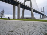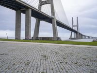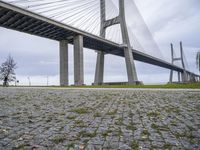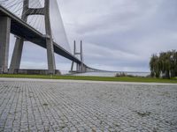 The grey sky provides a gloomy backdrop to the cityscape of Lisbon, Portugal, with its various bridges spanning the lake and connecting between the coastal biome and the urban design. The cable-stayed, concrete, and suspension bridges form a symmetrical line over the asphalt road surface, interspersed with trees, grass, and other vegetation. The composite material flooring provides an open space for recreation and thoroughfare, creating a unique landscape of infrastructure and nature.