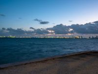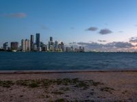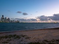 The sun rises over the coastal cityscape of Miami Beach, Florida, USA. The urban design of the open space is full of dirt and gravel surfaces, sand and ocean water.