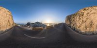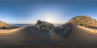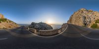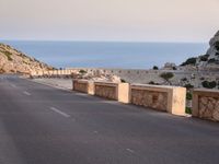 A guard rail with an Armco barrier stands atop a road overlooking the coast of Mallorca in the Balearic Islands, Spain. The clear sky and the break of day show the beauty of nature in the coastal landscape.