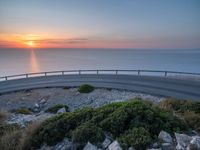 An Armco barrier curves around the guard rail on a coastal road in Mallorca, Balearic Islands, Spain at break of day. The asphalt road leads to a picturesque landscape of nature with a lighthouse in the distance. The sun is beginning to peek out from the clouds, illuminating the ocean water below in a bright and sunny morning.