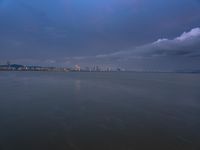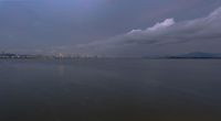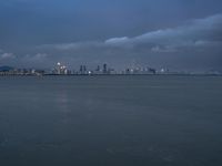 The peaceful atmosphere of dawn at the coastal city of Shenzhen, located in Guangdong, China. The river, lake, and ocean are all still, the sky filled with cumulus clouds and the horizon extending over the sea. A beautiful cityscape with a skyline on the horizon.
