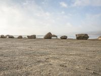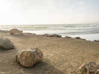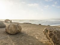 A serene morning at a coastal park in California, USA. The sun rises over the horizon, casting a golden light on the sandy beach, calm ocean waves, and rocky shore. The park offers open spaces, sandy trails, and recreational activities for visitors to enjoy.