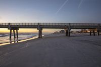 Sunrise over the sandy beaches of Florida's coast, creating a stunning natural landscape with open spaces and the vastness of the ocean. The clear sky and distant horizon blend with the concrete bridge and pier, providing a serene and recreational atmosphere. Jetty and boardwalk add to the emotional appeal of this tranquil scene.