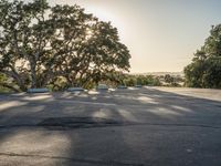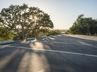 A scenic view of a road in California at dawn, with sunlight breaking through the clouds and shining on the asphalt surface.