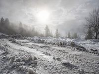 The sun begins to rise over the rugged German Alps, offering a glimpse of the snow-covered trees, glacial rivers, and frozen mountain landforms in the winter air. Nature's beauty is on full display in Europe, with the sun peeking over the horizon to light up the wilderness below.
