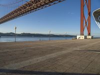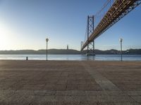 The break of day brings a beautiful calm to Lisbon, Portugal, as the sun rises above the coastal city. A bridge, jetty, and underpass form part of the city's infrastructure, while the harbor, beach, and lake bring a peaceful atmosphere to the horizon. Tree-lined roads, asphalt, sand, and wood provide a stunning backdrop to the day.
