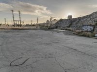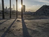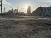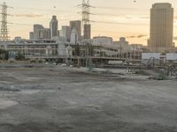A cityscape of Los Angeles in winter, with a skyline of high-rise buildings, construction sites, and open spaces, illuminated by the rising sun and reflecting on the wetland's surface.
