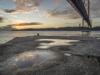 The break of day reveals the city of Lisbon, Portugal with its harbor, lake, beach, and jetty surrounded by the ocean, mountains, and sky. The morning sunlight bathes the asphalt, concrete, and wood surfaces and brings out the tints and shades of the calm coastal landscape.