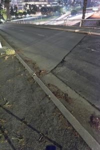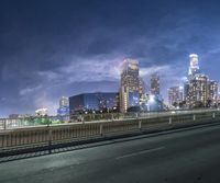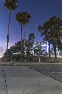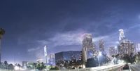 A road in downtown Los Angeles, California, USA is illuminated at dawn. The metropolitan area is filled with a high-rise skyline, urban atmosphere, and infrastructure including a walkway, road surface, lane, and vehicle. The cityscape is contrasted with a woody plant, such as a palm tree of the Arecales order, and the cloud-filled sky.