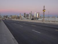 A panoramic view of the Los Angeles metropolitan area in California, USA, at dawn. The residential area, infrastructure, and modern architecture are all visible, including a highway, bridge, skycrapers, walkway, and Armco barriers. The horizon stretches out endlessly in this vibrant cityscape.