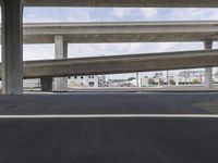 The concrete bridge of the controlled access highway casts a hard shadow across the asphalt and concrete of the open space in the metropolitan area of Los Angeles, California, USA, during the day. Automobiles can be seen traversing the lanes of the skyway and parking lot in the urban landscape.
