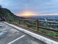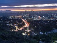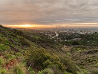 A view of the Los Angeles metropolitan area during dawn, with the sun just visible in the horizon, casting artificial light and sunshine across the cityscape and open spaces, while the dark grey sky and trees in the hills provide a rural atmosphere to the scene.