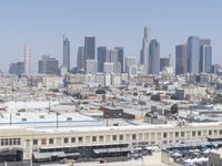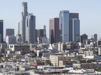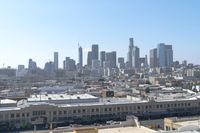 A clear sky reveals the silhouette of a city skyline, with high-rises and skyscrapers, residential areas and downtown. A roof of a building in the metropolitan area of the urban metropolis, with a window of a suburban home, illuminates at the break of day.