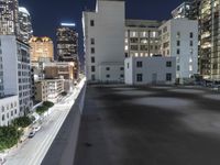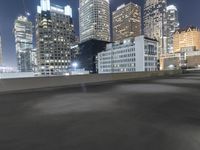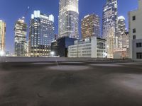 A view of the city skyline at dawn, featuring a mix of residential area, parkings garage, hard shadows of high-rises, concrete and asphalt surfaces, and a parking deck in the metropolitan area.