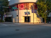 The sun rises over the urban design of Miami Beach, Florida, USA. A traffic light and open space are visible in the asphalt road as shoppers visit a storefront in the City Life.