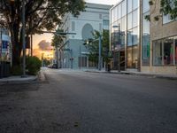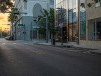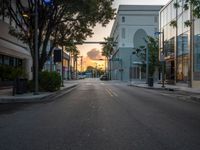 The sun is just rising over the road in the city of Miami Beach, Florida, USA. Cars drive down the asphalt street as storefronts and a traffic light illuminate the urban design at the break of day.