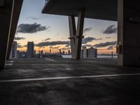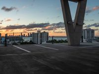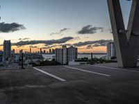 The skyline of Miami Beach, Florida, USA is illuminated by artificial light at the break of day. With skyscrapers, concrete surfaces, open spaces, and a parking lot, the urban design of the cityscape can be seen straight down the road.