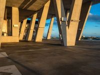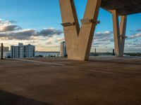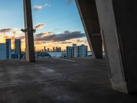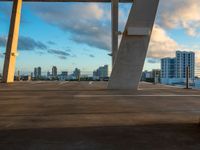 The low concrete surface of a parking lot in Miami Beach provides a view of the urban skyline at the break of day, with skyscrapers and clouds visible against the cityscape.