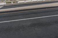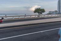 A stunning view of Miami's coastal highway at dawn, showcasing the city's urban infrastructure, including the highway bridge, guard rail, and Armco barrier, as it stretches along the beautiful ocean. The road surface, made of asphalt and tar, and the lane lines add to the modernity and efficiency of this mode of transport. The cloudy sky reflects in the water of the nearby river, creating a serene atmosphere.