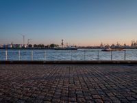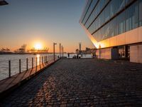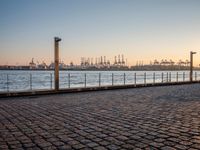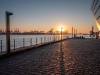 A cobblestone pier and jetty in the harbor of Hamburg, Germany, with the sun rising in the background, viewed from straight down the road.