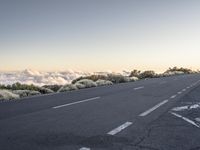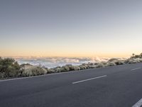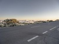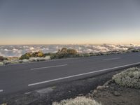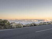 A low-angle view of a highway in Tenerife, Spain, winding through the mountain landforms and a valley with a clear sky and sunlight breaking at the horizon. The yellow-hued landscape of asphalt, infrastructure, trees, and plain nature stretch out beneath the clouds.