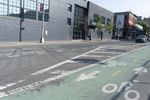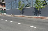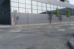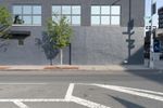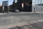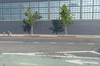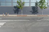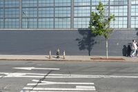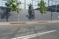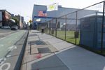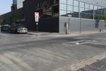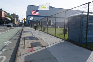 A view of the early morning in the bustling city of New York. The scene features the architecture of the residential area, including a brick wall, a fence, a parking lot, and a low profile building surrounded by vegetation and public space.