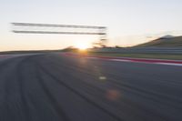 The straight down the road of the highway illuminated by dawn sunlight, with the infrastructure of the red race track in the distant horizon, and the automobile in motion blur creating a fixed link in this lane of mode of transport.