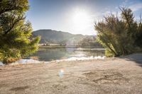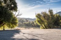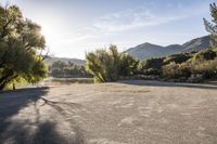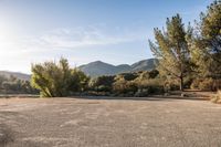 A beautiful sunrise illuminates an elevated road in Ojai, California, USA. The clear sky and sunshine create a breathtaking landscape, with mountains and trees in the background. This rural destination offers open space and a serene natural environment.