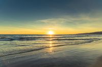 A breathtaking view of the dawn breaking over the coastal shoreline of Los Angeles, California, USA. The sun's rays illuminate the sandy beach and shimmering water, creating a tranquil scene of open space and natural beauty.