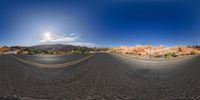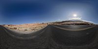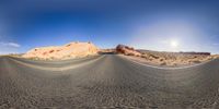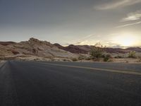 A low angle view of a road stretching through the Colorado desert at dawn, surrounded by majestic mountains. The landscape showcases the natural beauty of the mountain landforms with yellow light illuminating the asphalt. The clear sky and sunshine create a serene atmosphere in this wilderness, with contrails visible in the distance.