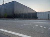 An industrial storage facility in Salt Lake City, USA set against a clear sky at the break of day. The gravel and dirt surface is surrounded by vegetation, providing a stark contrast to the factory and warehouse profiles.