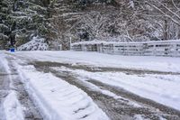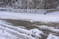 A gloomy and grey sky casts a gloom over a residential road in Toronto, Ontario, Canada at dawn. The snow-covered road surface is lined with trees and vegetation, with street lights illuminating the landscape. A wooden split rail fence and branches with snow can be seen, adding to the winter scenery. The freezing lake, grass, and woody plants create a natural environment, while the slope and tire tracks on the road highlight the infrastructure. The dawn sunlight reflects on the water, creating a serene and peaceful atmosphere.