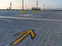 The hard shadows of the dawn light casts across the asphalt surface of a parking deck in the residential suburb of Los Angeles, USA. Straight down the road, the open space of a parking lot or garage is seen in the profile of the clear sky.