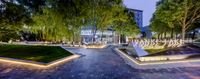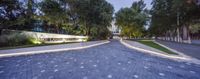 A straight road illuminated by artificial light at dawn in Suzhou, China, surrounded by suburban homes and lush greenery, creating a peaceful and inviting atmosphere.