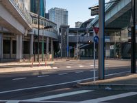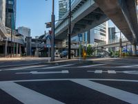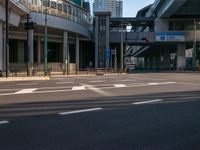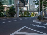 A modern office building and bridge in Tokyo cast a hard shadow on the asphalt road as the break of day begins in the city's busy business district.