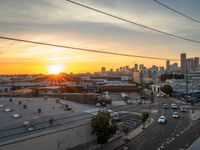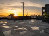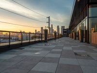 A stunning city skyline at dawn, showcasing the urban design and concrete surfaces of 1/4角 city. The sun visible, casting a warm glow on the skyscrapers and open spaces, creating a sunny and vibrant atmosphere in this bustling city.