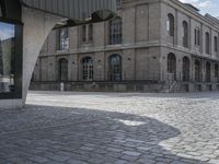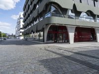 An aerial view of Berlin, Germany featuring a mix of modern architecture, cobblestone roads, public spaces, parking lots, and classic buildings. The bustling cityscape of Europe's business district shows a vibrant urban design with red doors, concrete streets, trees, and a variety of other architectural details.