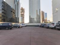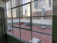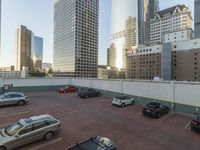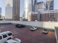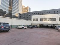 A mid-size car travels straight down the road in a metropolitan area, passing by a high-rise condominium with a parking deck and a skyline of skyscrapers in the background. The concrete and brickwork facade of the building is lined with windows and balconies, and further highlighted by the clear sky and the infrastructure of the city.