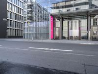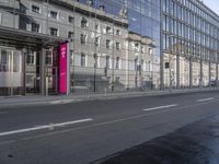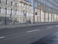 A view of a modern urban landscape in Berlin, Germany, featuring a glass wall facade, a line of trees, a mixed-use business district, an office building, a residential area, and a road surface with asphalt and iron infrastructure.