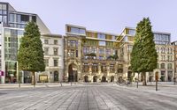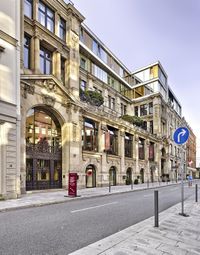 A bustling city street in Hamburg, Germany, offers a mix of classic architecture, urban infrastructure, and modern storefronts. With its rich history and vibrant culture, the neighborhood is bustling with activity, from people out to eat and shop, to travelers staying in nearby hotels. A clear sky reflects off the pavement and brick walls, creating a beautiful scene of urban life in Europe.