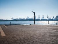 A modern architecture pier overlooks a parking garage, parking lot, and jetty in Hamburg, Germany on a clear European day with contrails in the sky.