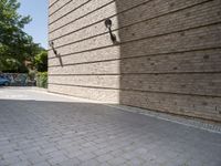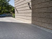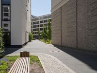 A black-and-white photograph of a modern architecture in the residential area of Berlin, Germany. The asphalt road is lined with a cobble stone curb, manhole covers, and outdoor benches. The plant community is comprised of trees, shrubs, and groundcover. The clear sky provides a backdrop to the high-rise buildings and tints and shades of the automotive tire.