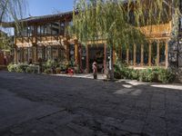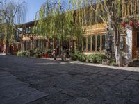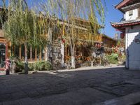 A snapshot of the old town of Shangri-La, Yunnan, China, featuring the city's classic architecture, cobble stone roads, low porches, and lush vegetation. Tourists can enjoy the cafes, restaurants, and tourist attractions as they explore the residential area of the neighborhood and the mixed-use property of the village.