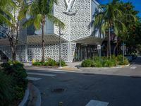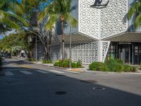 A view of a city street with modern architecture, a crosswalk, and storefronts in Miami Beach, Florida, USA. People can be seen crossing the road, and the sun casts a hard shadow on the asphalt.