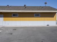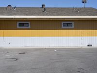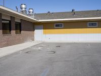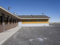 A beautiful desert architecture in Utah, USA, featuring a residential area with houses and buildings, surrounded by the vast desert landscape. The sunny day enhances the details of the facades, roofs, and yellow siding, creating a stunning visual. A cafe and a restaurant are also visible, providing options for dining out. The image showcases the material properties of the buildings, while a gas station and a parking garage with a line of garage doors complete the urban scene.